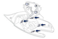 - ouvrez le coffre, - retirez la grille d’accès sur la garniture latérale correspondante, - dévissez l’écrou et retirez-le, - débranchez le connecteur du feu, - déclippez le feu et sortez-le avec précaution en le tirant dans l’axe vers l’extérieur, - appuyez sur les quatre languettes et retirez le porte-lampes, - tournez d’un quart de tour la lampe et remplacez-la.